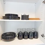 Πλήρως εξοπλισμένη κουζίνα με φούρνο μικροκυμάτων, ηλεκτρικό βραστήρα και ψυγείο είναι επίσης διαθέσιμη.
